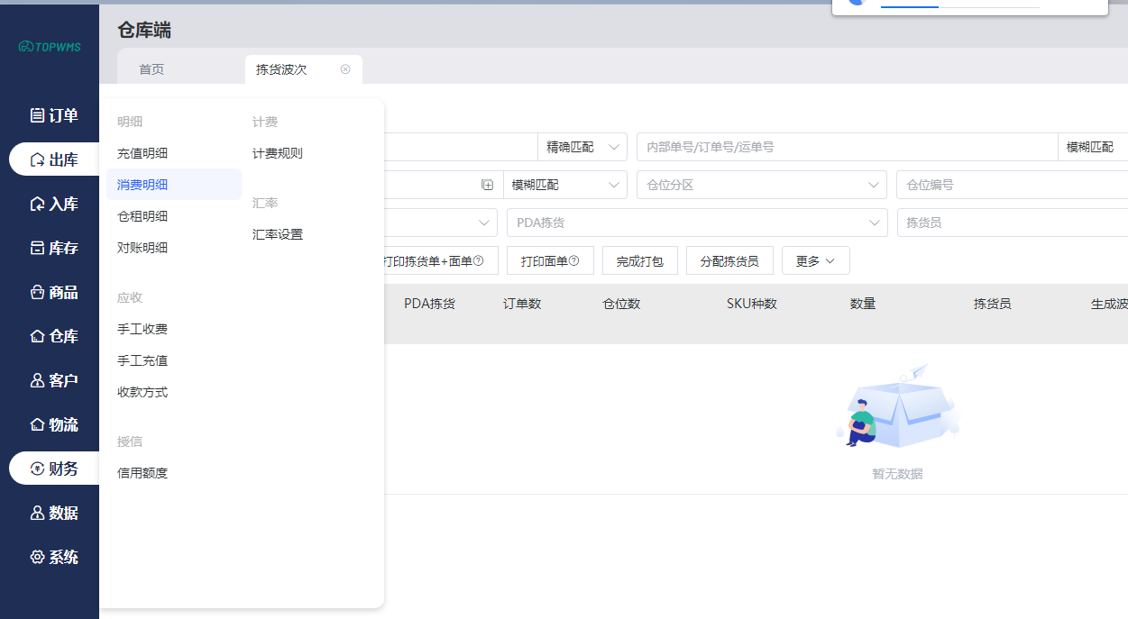 TOPWMS通过分组管理+实时记录消费+多重计费规则等功能设计,破解海外仓企业财务对账混乱的痛点,系统支持对客户进行分组管理,还支持多重计费规则,且系统会实时同步每一步出入库作业的费用数据,货主可通过系统查询消费明细,提高财务核算效率的同时,杜绝账目不清晰、混淆的风险。
